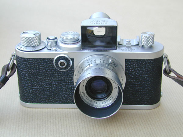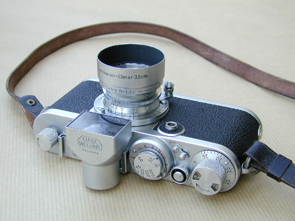 Leica If de 1955 équipé d'un Summaron 3,5 cm f/3,5 coiffé de son pare-soleil (FOOKH/12505), du viseur à miroir (SBLOO/12010) et de la courroie en cuir (TSOOV/14092).