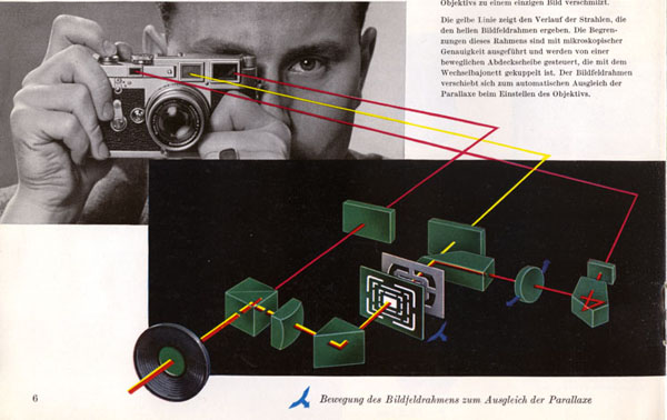 Remarquer, sur ces deux schémas en "3 D" du viseur de tous les autres Leica "M" (en l'occurrence il s'agit de ceux du M2 et du M6), que le trajet optique commun de l'image du cadre sélectionné et de l'image télémétrique vers le prisme diviseur n'est pas le même (ce trajet paraît simplifié et est "oblique", alors que chez le Leica M3 il se révèle plus complexe et s'avère "pluri-orthogonal") ; remarquer également que les éléments optiques décrits ci-dessus dans le cas du M3 se retrouvent, mais que certains ne sont pas disposés de la même façon et qu'il en existe un supplémentaire.