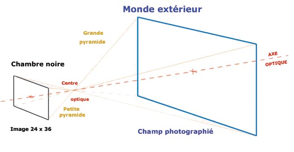 - Le sommet de cette pyramide est situé au centre optique de l'objectif et son axe est évidemment confondu avec l'axe optique, qui est perpendiculaire en son milieu au format 24x36 mm de l'image projetée sur le film.
