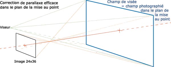 - Les axes optiques du viseur et de l'objectif sont parallèles et se coupent à l'infini, au centre du champ rectangulaire de l'image.