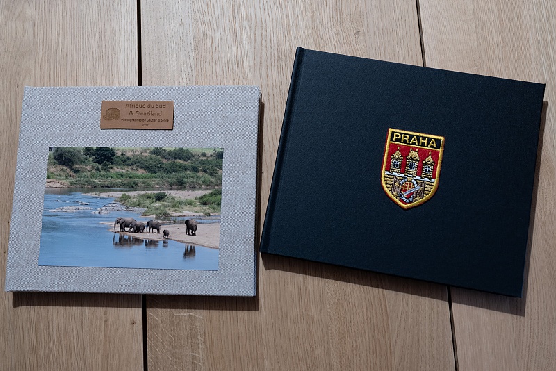 Voir en plus grandAvec Blurb, on peut s'amuser aussi avec les couvertures. À gauche (Afrique du Sud & Eswatini), j'ai collé un tirage et du cuir gravé sur un lin naturel. À droite (Prague), j'ai collé un patch acheté dans une boutique de souvenir, sur un lin noir.