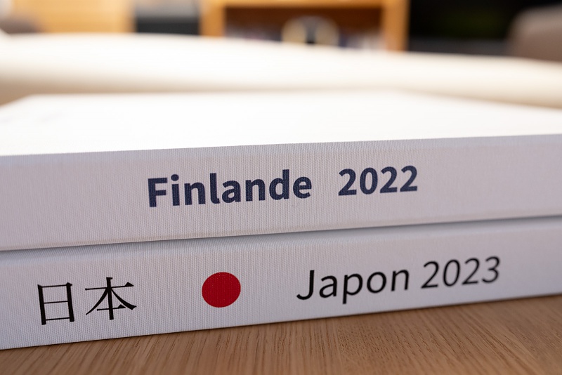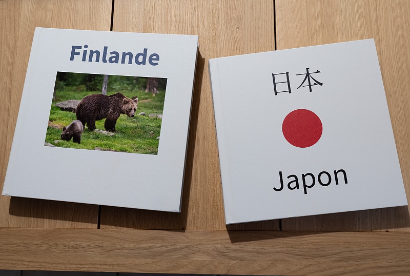 Deux albums Saal (avec papier contrecollé pour avoir des doubles pages sans coupure ; au détriment d'une épaisseur ... épaisse), couverture lin. À droite, pour l'album "Japon", j'ai utilisé uniquement Saal Design (texte et drapeau). À gauche, pour l'album "Finlande", j'ai collé