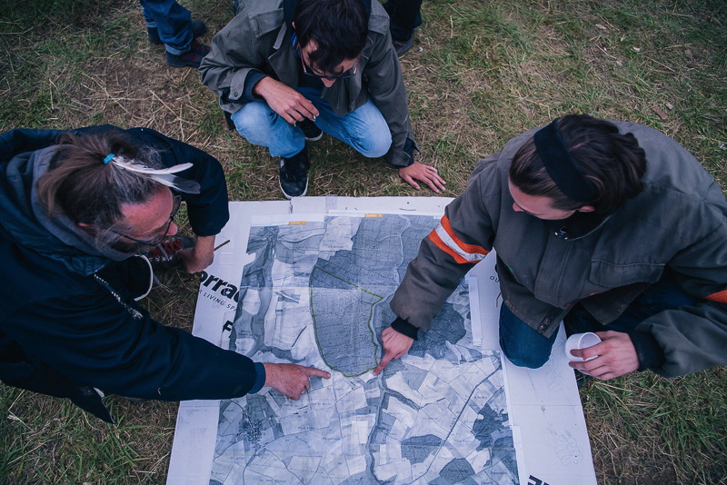 3. Des militants étudient une carte de la zone pour préparer une action. Au cours d'une promenade en forêt en juin 2016, ils découvrent que l'Andra a défriché une partie d'un bois communal, dit bois Lejuc, situé à quelques kilomètres de Bure. C'est dans cette zone que devront être installées les cheminées d’aération des kilomètres de galeries souterraines du projet.