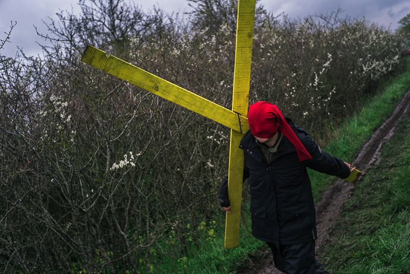 6. Cagoulé par volonté d'anonymat, un opposant transporte une croix qui servira à la construction d'une vigie pour surveiller un champ convoité par l'Andra.