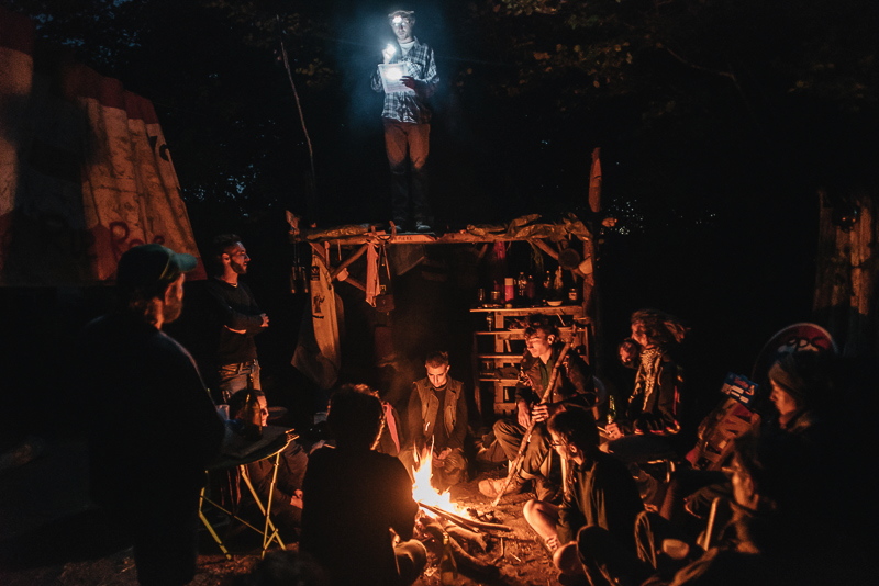 7. Lecture de textes autour du feu. En réponse à la découverte des travaux dans le bois Lejuc, un camp autogéré a été créé dans la forêt pour freiner l'avancée de l'Andra. Entre 20 et 50 personnes sont sur les lieux. Sur les réseaux sociaux, le mot d'ordre est alors "#Occupylameuse".