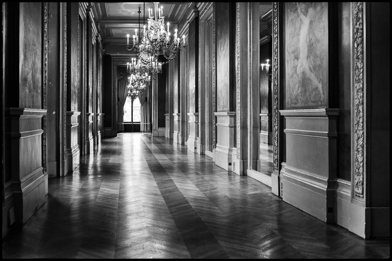 Je n'arrive pas à savoir si je trouve qu'il manque définitivement quelqu'un ou quelque chose dans ce superbe couloir, ou si le couloir se suffit justement à lui même. Je pensais le traitement un peu fort au début, et puis j'ai finalement eu l'impression qu'il devait correspondre au "lustre" de l'endroit. |