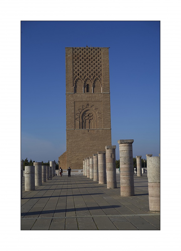 Il s'agit d'une tour destinée a devenir le Minaret de la plus grande Mosquée de l'époque sous le règne du Sultan Yacoub El Mansour dont la construction a débuté en 1196. El Mansour veut dire le victorieux en référence a sa victoire écrasante contre l'armée du roi de Castille Alphonse VIII à la Bataille d'Alarcos en 1195. La Tour Hassan est le vestige de la grandeur de la Dynastie Almohade et de leur emprise sur un vaste territoire allant de l'Afrique du Nord à la péninsule Ibérique (Al Andalous), au 12è siècle. Elle présente de fortes similitudes architecturales avec la Giralda de Séville et la Koutoubia de Marrakech au point que plusieurs historiens évoquent le même architecte à l'origine des 3 minarets. L'influence architecturale Almohade en Espagne est assez bien documentée. Particularité de ce minaret : il n'y a pas d'escalier à l'intérieur, mais une rampe permettant au muezzin d'arriver au sommet de la tour à cheval (mulet ?) pour l’appel à la prière. L'accès est fermé au public depuis fort longtemps, mais je me souviens y être monté plusieurs fois à pieds étant gamin. |
