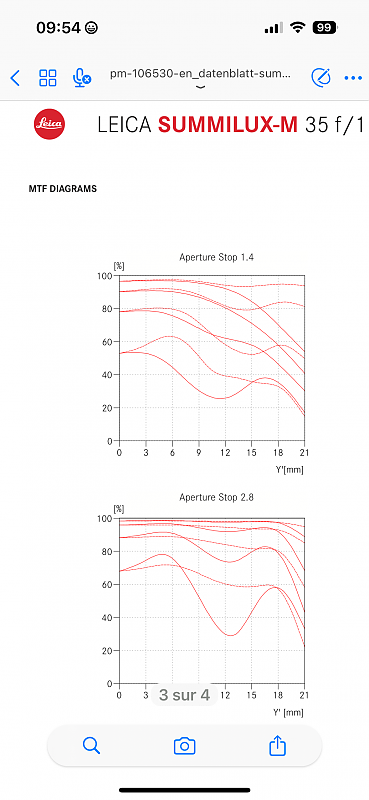 J’ai testé hier ce dernier Lux 35 ASPH sur M11 et me pose encore des questions…. Oui il est plus homogène que mon vieux cron 35 ASPH mais je n’ai pas ressenti l’effet Whaou…. Peut être n’ai je pas assez travaillé sur des sujets proches pour comparer les bokeh Cela dit en ré-regardant les courbes MTF, je ne suis pas surpris car à 2 et 2.8 je ne trouve pas qu elles sur-performent notamment sur celles du bas (40 lignes /mm). Comparé aux courbes des cron asp 90 et super Elmar 21, les résultats sont nettement meilleurs pour ces 2 derniers. ![]() Cela vient il du fait qu’il est plus compliquer de superformer avec des optiques Summilux qui ouvrent à 1.4 ? Un avis sur ces courbes ? Bref, je me cherche encore notamment au regard du budget , à lâcher mon cron pour ce Summilux …. J adore pourtant sa mise au point rapprochée à 40 cm. Je sens bien qu’il me plaît mais ne suis pas sûr que l écart en vaille la chandelle ! Je regarde également le nouveau cron 35 et là je ne comprends encore moins son tarif stratosphérique (plus de 7000 si je me rappelle…) une idée de ce qui le justifie ? Je pense que je dois encore repasser par la phase essai mais aimerais bien vos retours d expérience…. Merci |