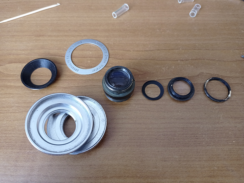 Bonjour, je viens de récupérer un Elmar 5cm 3.5 en monture M des années 50. J'ai procédé au démontage complet et me retrouve à la toute fin bloqué par des éléments optiques à priori non vissés/non maintenu par des bagues filetées. Serai-ce collé ? Sur le 50/2.8 c'est très facile, il suffit de dévisser la bague frontale avec les deux fentes pour sortir la lentille avant. Rien de cela sur le 3.5 Reste donc le premier élément /// diaphragme /// suivi de la lentille centrale (le groupe arrière étant sorti) dans mon cas. J'ai des champi entre la 1ere et 2eme lentille..... Pouvez vous m'aider pour la suite des procédures ? Danke ![]() frontale au centre, groupe arrière démonté sur la droite de l'image ![]() lentille centrale vu de l'arrière (côté boitier). Tourne dans le vide.... |