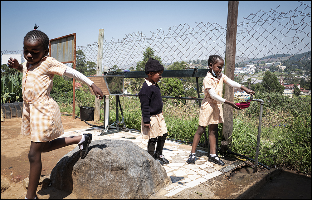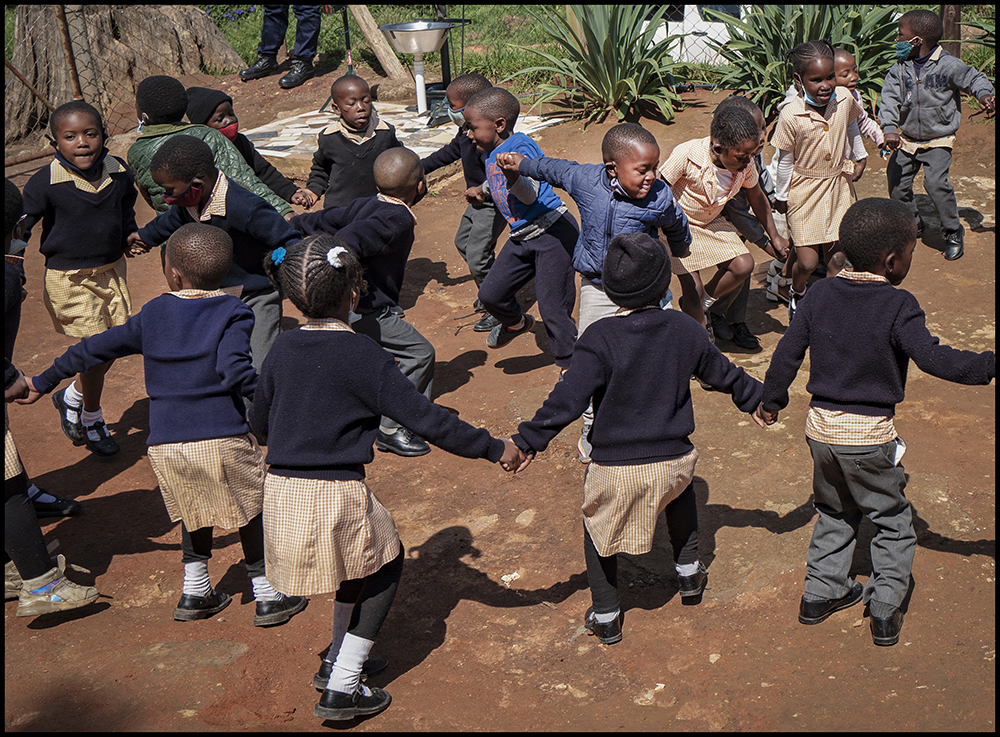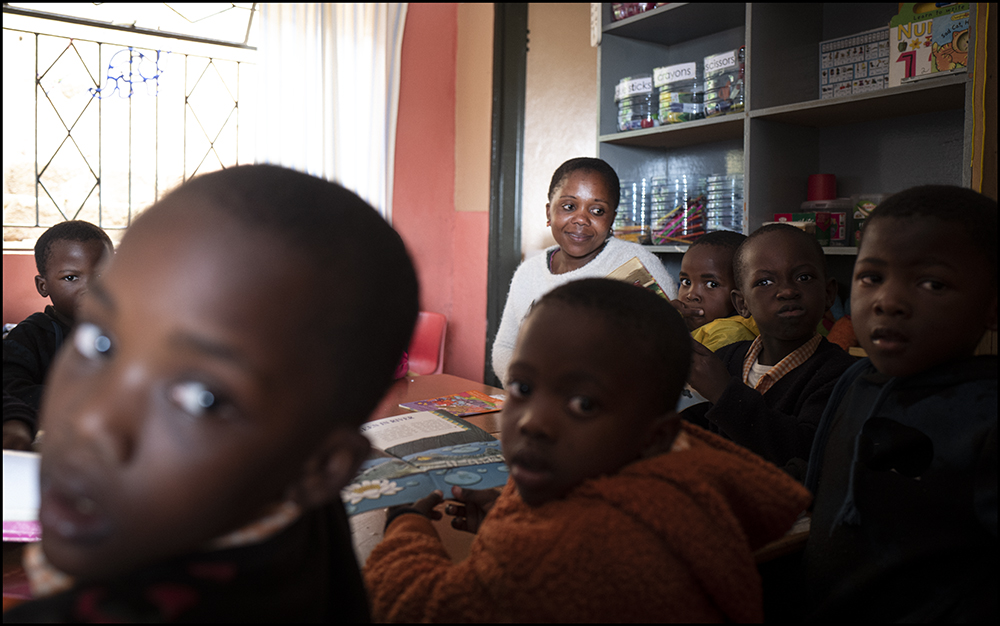 En laissant Johannesbourg, quelques heures de voiture à travers les paysages infinis d'Afrique du Sud amènent au pied des montagnes paisibles du Swaziland, au petit royaume d'Eswatini. A flanc d'une colline surplombant une capitale modeste, vivent quelques townships parsemés de cabanes de tôle et de véhicules rouillés que la végétation engloutit. C'est là que se trouve l'école de Madame Lindiweh, qui ouvre ses portes aux enfants les plus démunis. Avec quelques fonds privés, des dons de l'hôtel Hilton, et l'appui du Rotary par la grâce d'une Anglaise retraitée qui vit là, l'école tient bon et accueille une centaine d'enfants. Les sourires feraient oublier que tous sont orphelins d'un parent ou des deux; père ayant déserté dans le meilleur des cas - ce qui est préférable aux sévices dont beaucoup d'entre eux ont été victimes - ou mort du Sida. Quand la mère manque aussi, le plus courrant est qu'elle est décédée également du VIH qui fait des ravages dans ce pays. Il touche 20% de la population. Les enfants vivent chez une tante, une grand'mère, un grand'père, qui n'a guère que le gîte à leur offrir. Amahleh est une grand'mère du quartier. Elle vient tous les vendredi aider comme elle peut: elle fabrique les uniformes sur une Singer donnée par le Rotary. La directrice, Lindiweh, montre le potager, dont les légumes consituent un apport important. L'école fournit un repas chaud par jour aux enfants. L'institutrice, Busisiweh, connaît tous leurs secrets. Elle leur apprend l'anglais, deuxième langue du pays avec les livres récoltés auprès de donateurs. Difficile d'être discret dans une si petite classe, même avec un Leica Q. Siviweh profite de la balançoire. On aperçoit le Hilton, seul bâtiment moderne de la ville, qui aide l'école avec des dons en nourriture. Octobre 2022 |
