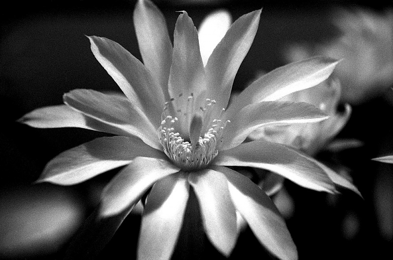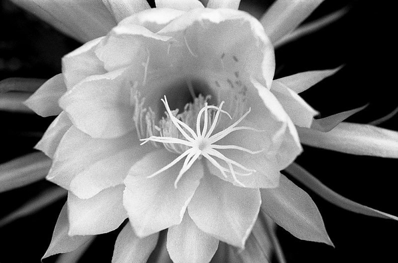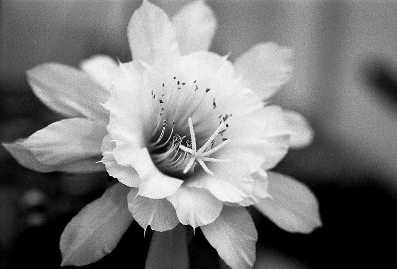 C'est à partir du printemps dernier que j'ai commencé un travail argentique tout en noir et blanc sur le thème des fleurs dont l'issus sera sans doute une future exposition. Le photographe allemand Albert Renger-Patzsch et la photographe américaine Imogen Cunningham travaillaient ce sujet, eux à la chambre, ce qui me rend plus admiratif. Sans les copier, j'essaye de retransmettre les textures des ces fleurs avec une faible profondeur de champ, autour de 5,6/8 pour donner plus de relief. Certaines, 2,3 et 5, sont prises presque dans la nuit ou très tôt le matin à cause de leur floraison nocturne. ![]() 1, Parodia warasii ![]() 2, Echinopsis subdenudata ![]() 3, Epyphyllum oxypetalum ![]() 4, Stapelia variegata ![]() 5, Selenicereus grandiflorus (Reine de la nuit) ![]() 6, Iris rhizomateux ![]() 7, Lilium candidum (Lys blanc) ![]() 8, Hibiscus des marais ![]() 9, Begonia semperflorens ![]() 10, Anemone hupehensis (Anémone du Japon) |