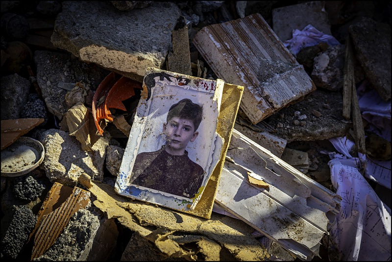 Photo 1 : Turquie, centre-ville de Kahramanmaras : Seule rescapée dans les décombres, cette photographie d'un jeune adolescent, fixée dans le cadre et le seul témoignage de vie retrouver dans les ruines de son immeuble.