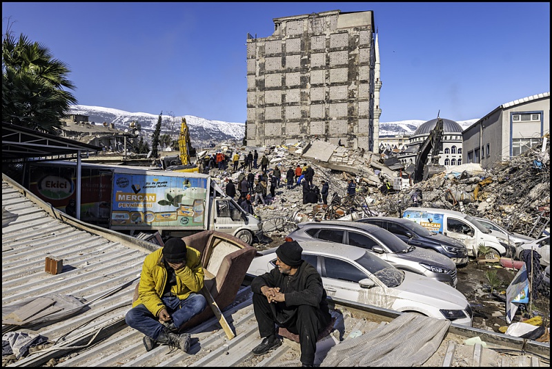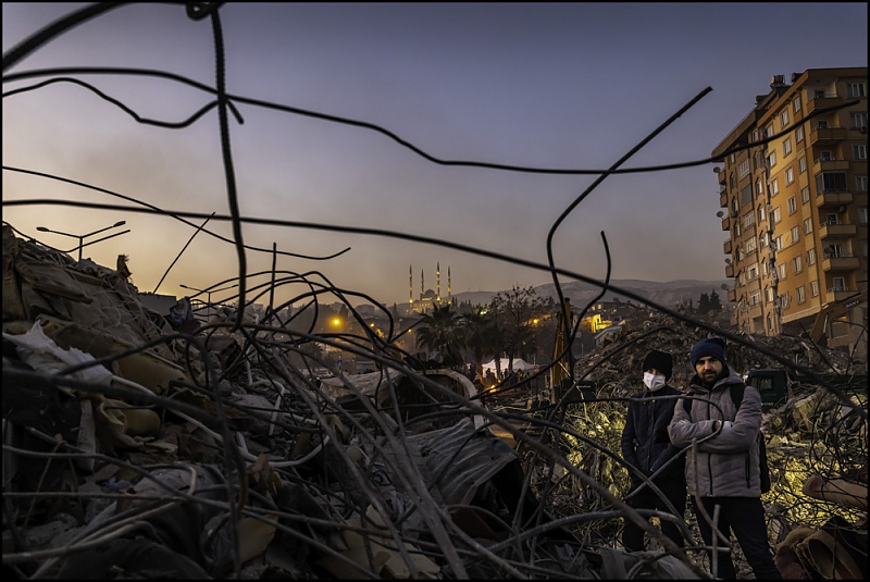 Photo 10 : Turquie, centre-ville de Kahramanmaras : Dans leur tragédie, deux regards enfermés dans les décombres. Au loin se dresse la mosquée Adulhamidhan, comme un symbole d'espoir dans l'obscurité naissante