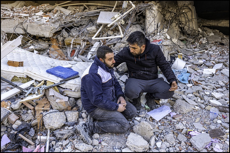 Photo 5 : Turquie, centre-ville de Kahramanmaras : Dans les bras de son frère, les larmes de cet homme coulent sans retenue. Les pompiers viennent de lui annoncer que sa sœur est décédée et que son père ne pourra être sauvé. En effet la structure est bien trop fragile ce qui compromet grandement la sécurité des trois pompiers engagés dans les décombres.