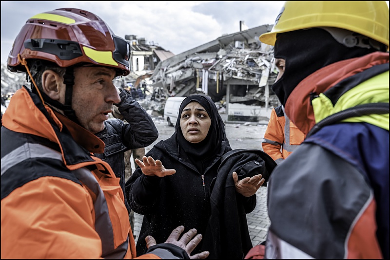 Photo 6 : Turquie, centre-ville de Kahramanmaras : Le visage marqué par la peur et la détresse, cette femme implore les Pompiers de l'Urgence Internationale de venir en aide à sa famille pris au piège de leur immeuble depuis 4 jours. Cette jeune femme restera plus de 24 heures aux côtés des pompiers et des sauveteurs Turcs, priant et implorant le ciel, la miséricorde ne viendra malheureusement pas.