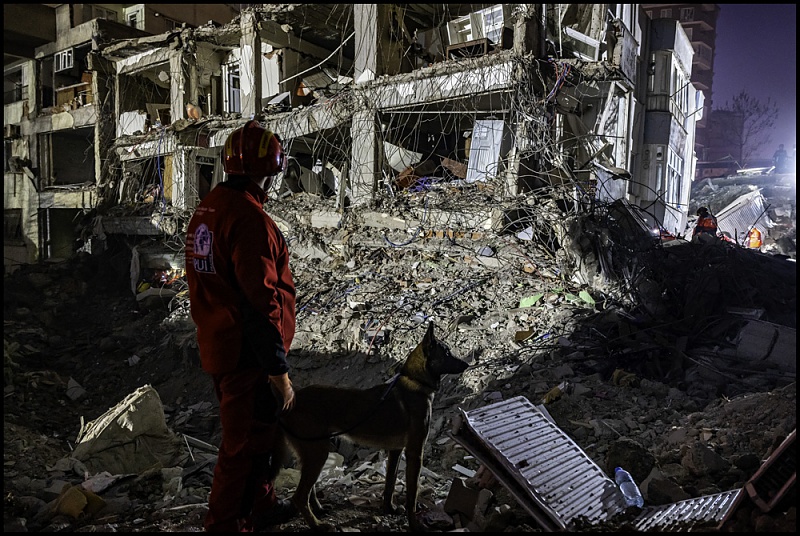 Photo 9 : Turquie, centre-ville de Kahramanmaras : Guidé par la lumière de la ville, le maître-chien avance prudemment dans les décombres de l'immeuble effondré. Dans cette nuit de décor de cinéma, leurs déterminations illuminent l'espoir de retrouver des survivants.