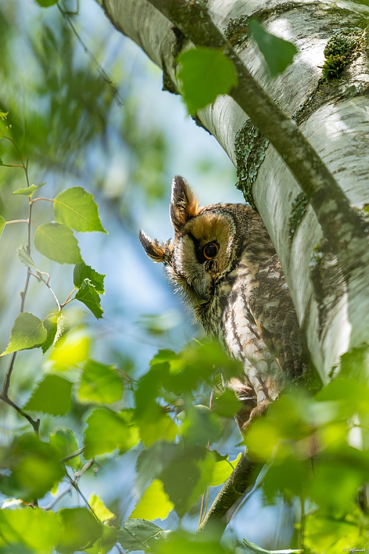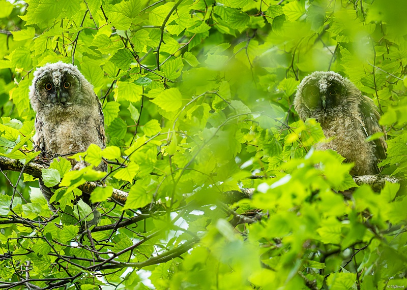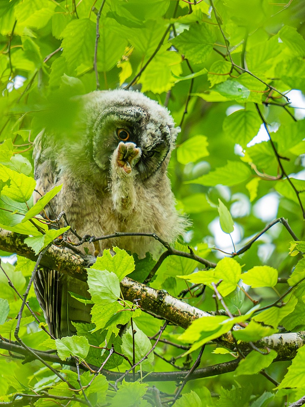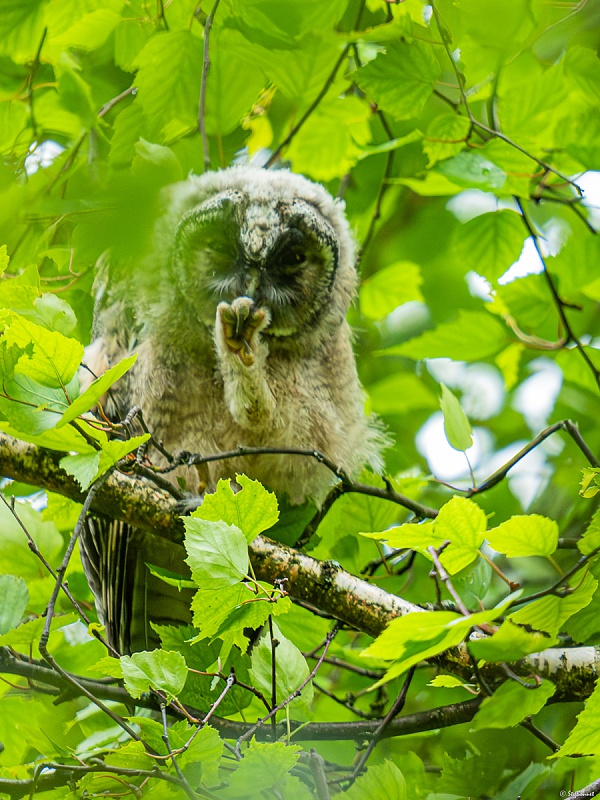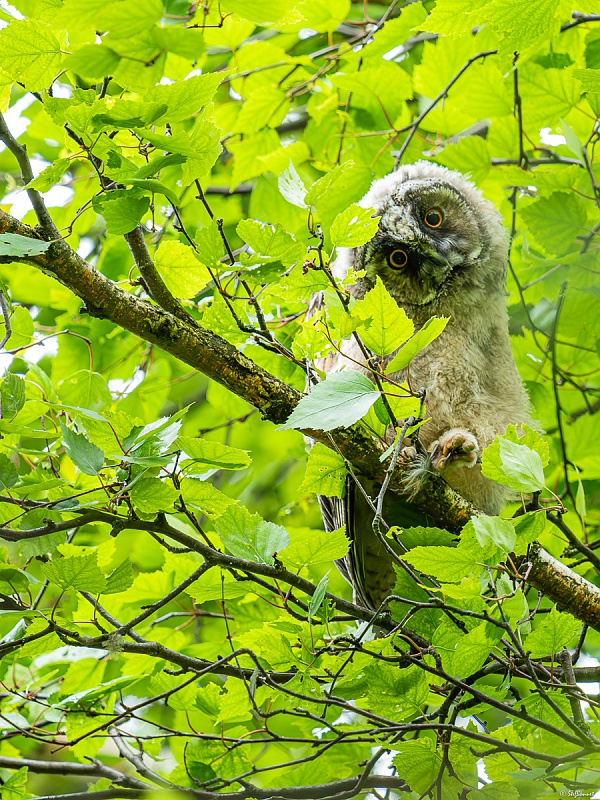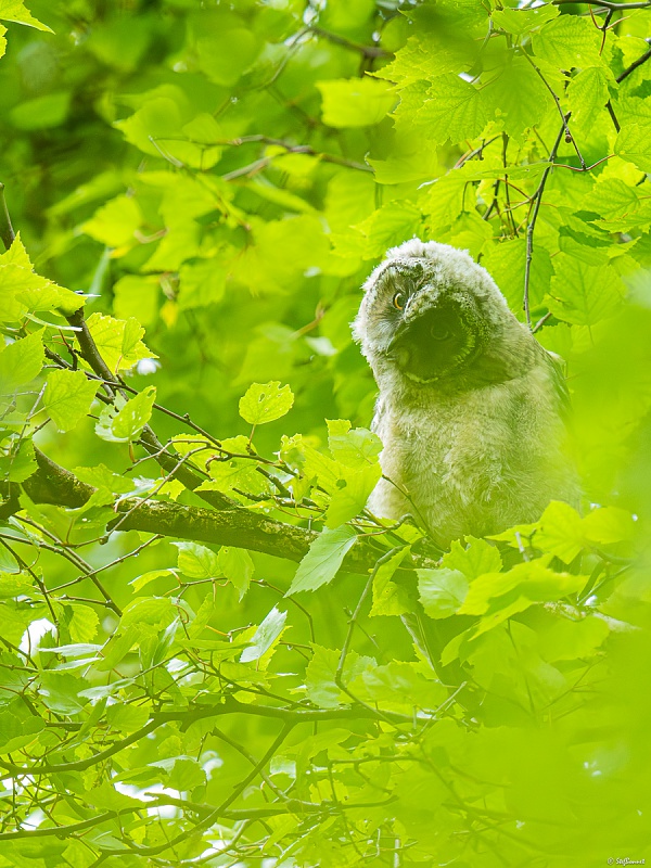 Bonjour à toutes et tous Des hiboux moyen-duc ont élu domicile dans le parc arboré de mon voisin. Celui-ci (comme mon terrain) est en bordure de champ, et présente bouleaux, grands sapins et mélèzes; c'est pour les parents un endroit idéal pour chasser les petits rongeurs sans trop s'éloigner du nid et des petits. Cela fait plusieurs semaines que je les entends ululer de temps en temps; je les ai cherchés mais sans succès jusqu'à cette semaine. Les juvéniles sont déjà capables de voler, donc ils se cachent moins, même si les poussins ont encore besoin des parents pour se nourrir. Toutes les photos ont été prises au "bazooka" Sigma 150-600 sur SL2, lundi 27 en fin d'après-midi pour les juvéniles, et mardi 28 en fin de matinée et début de soirée pour la mère. 1) Les juvéniles, pour commencer (j'en ai vu deux) : ![]() 2) Crop sur la première : ![]() 3) Il retire le duvet sur sa patte : ![]() 4) Chhhuuuuttttt !!! (elle manque un peu de netteté, mais j'aime la posture) ![]() 5) Filtré par le vert du feuillage : ![]() 6) Curieux... ![]() 7) ... Mais pas trop longtemps. "Maintenant, stop, ou je te jette un sort !" ![]() J'ai donc arrêté de les déranger ce jour-là. Le lendemain, j'ai capté la mère qui surveille progéniture et intrus depuis la même branche. Elle regardait en direction du soleil, ce qui était bien pour les photos. 8) Vu ! ![]() 9) "Bon. Pas dangereux." (c'est la photo que je préfère; les aigrettes sont bien détachées du fond, la position, la netteté et la lumière sont... Chouettes ![]() 10) "Toujours là, lui ?" ![]() 11) Le soir, elle est toujours sur la même branche. En défilement vertical depuis le tronc du bouleau : ![]() 12) Camouflage... ![]() J'y retournerai ce soir, en espérant voir le père nourrir les juvéniles. Ce serait la cerise sur le gâteau, même si la photo est loupée (je m'attends à des ozizos Cordialement, Stef. |