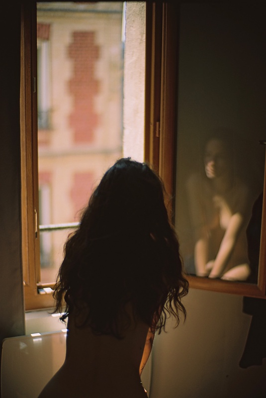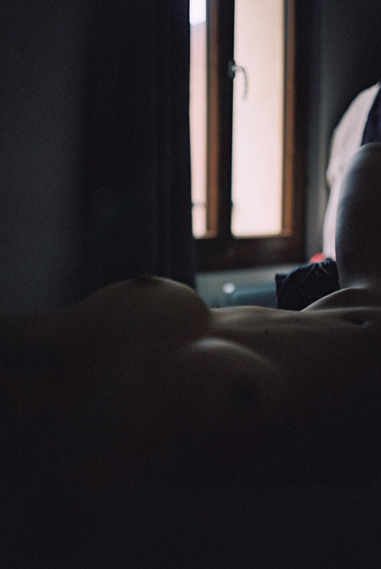 Bien sur les couleurs de la Portra, mais bien plus que ça: Les courbes des ombres de la ferronnerie, la lézarde sur le mur, les lignes des raccords d'enduit, ebcadré par la courbe du haut du mur, tout cela ramène l'oeil a gauche quand il voudrait s'échapper à l'horizon. Tout ça "habille" complètement ce beau nu, qui à mon sens n'en devient plus un. C'est maintenant un beau portrait de vacance intime et plein de pudeur. C'est vraiment très réussi. |