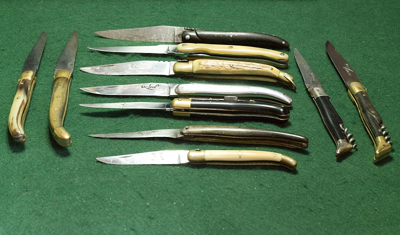 Paradoxal a écrit : Pas mal comme ensemble.En revanche, je suis étonné de n'y voir aucun couteau issu de l'atelier Jacques Mongin ! On y produit de superbes objets. J'en possède plusieurs dont un canif multi lames au manche en ivoire. Aussi un couteau en damas, manche en bois de cerf. Et beaucoup d'autres... Si, moi j’en ai un, un Mongin Yatagan 12cm corne blonde marqué Courty (coutellerie à Paris.) ![]() Autrement j’ai toute une panoplie de Laguioles d’âges divers, achetés ou offerts et utilisés selon l’humeur du moment. Tous à la maison car leur port ou leur transport sont illégaux. ![]() L’on pourra reconnaître un David automatique, un Starck emmanché d’aluminium, un très ancien couteau dont la lame est presque arrivée au talon, le mini Laguiole de Madame, un Charles Couttier à liner-lock fabriqué près de Vichy. Un Damas au manche corne noire qui s’est malencontreusement retourné au moment décisif. D’autres à lame inox ou acier au carbone. Veni Vidi Vissi ! |