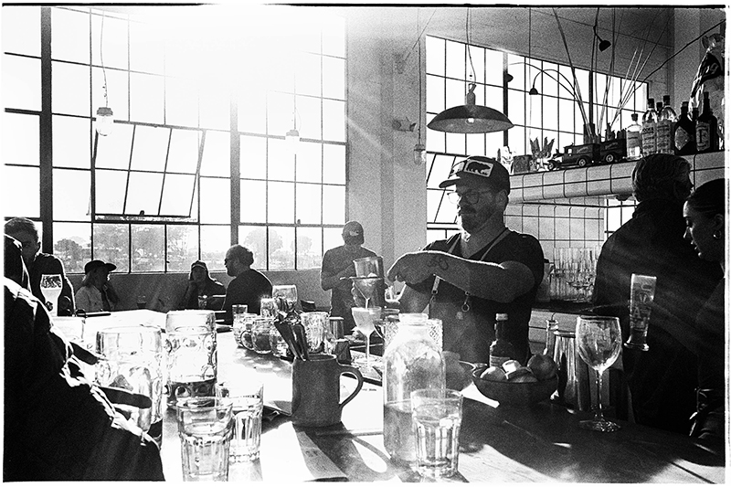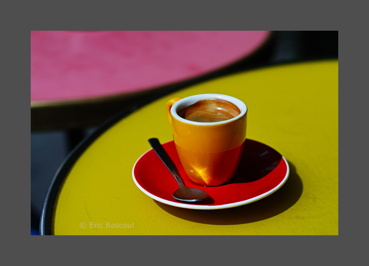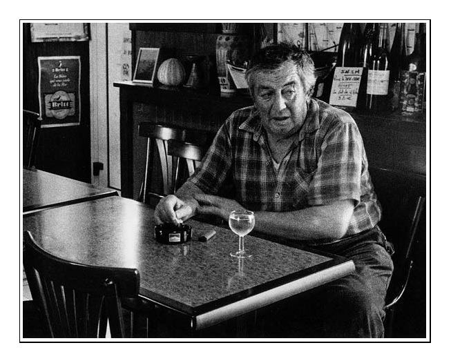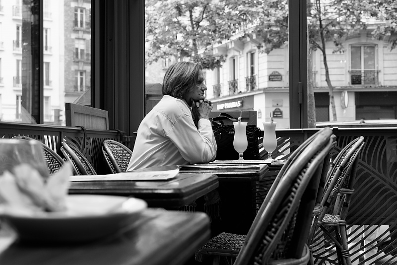 sur l'image suivant de Loohw, je regrette la presence un peu force de la chaise du premier plan à droite. Elle empeche un peu de voir la chaise vide en face de la dame qui attend le retour du destinataire du deuxième verre. Le traitement Noir et Blanc est remarquablement equilibré a mon gout. |