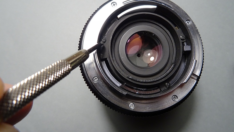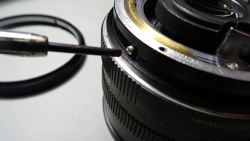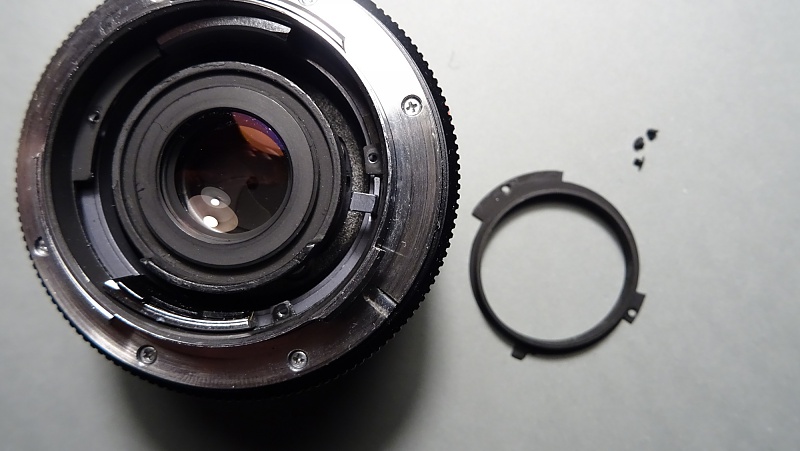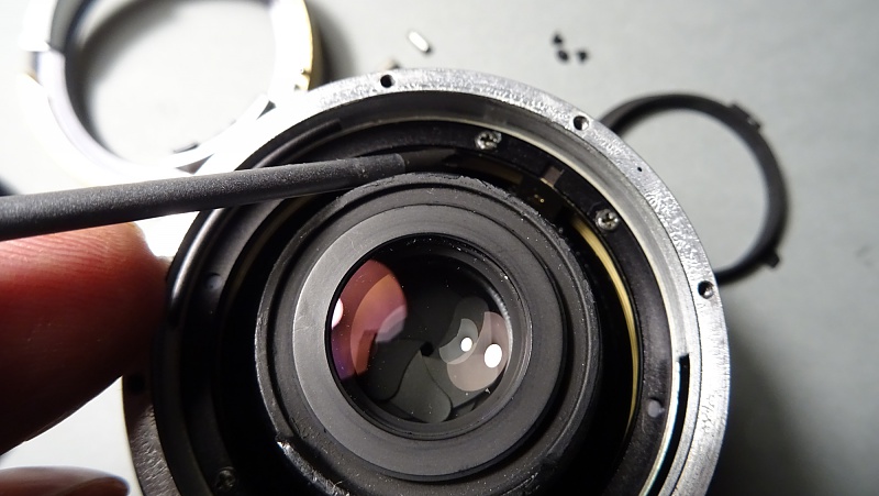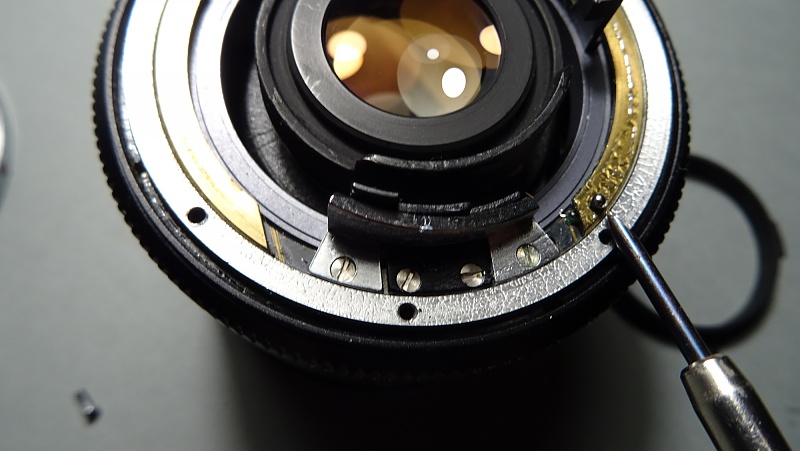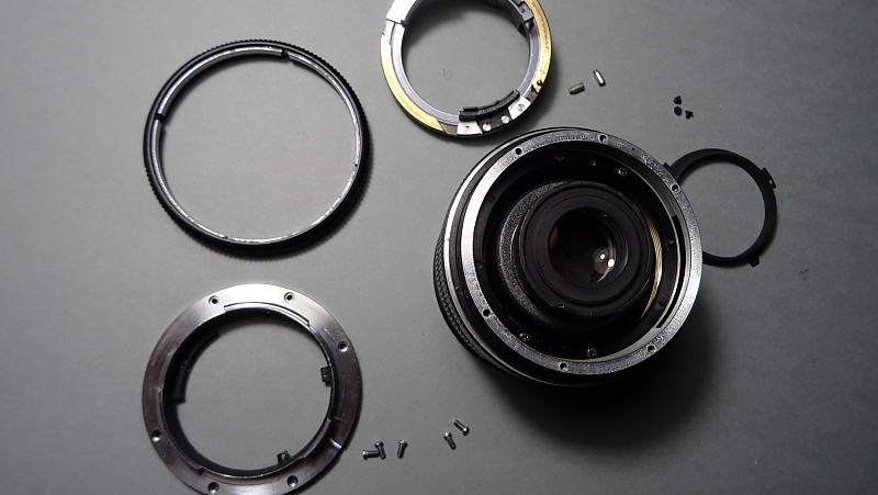 Les leicaïstes sont généralement très sensibles sur les questions de perfection ou d'imperfections de leurs équipements. Comme c'est un peu mon cas, le léger jeu que je sentais dans la bague de mise au point de mon Elmarit 35 mm, finit par me convaincre de la nécessité d'intervenir. N'ayant pas les moyens de me payer une révision, je me suis lancé (encouragé il est vrai par quelques tutos de Mikeno62). Le résultat est parfait. Les photos suivantes et le descriptif des opérations aideront peut-être un.e summiluxien.ne à retrouver le plaisir (maniaque ?) d'une bague sans jeu. La première précaution à prendre est de travailler sur un plan de travail assez étendu et couvert d'une feuille blanche. De très petites pièces peuvent facilement s'échapper compromettant le remontage correct et donc le bon fonctionnement de l'objectif. ![]() La première étape consiste à retirer le cache en plastique noir maintenu par trois vis très courtes (attention lors du remontage à ne pas les laisser tomber dans le corps de l'objectif). Afin de faciliter le retrait de ce cache en plastique, placer la bague de mise au point sur la distance minimale. ![]() Une fois le cache retiré, on peut dévisser les six vis (longueurs égales) de la bague porte-baïonnettes. ![]() Attention cette fois-ci à ne pas perdre la petite bille servant à cranter la bague de diaphragme. Elle est simplement posée sur un très petit ressort logé dans un puit. Si ce ressort n'est pas maintenu par un peu de graisse, il peut s'échapper lui aussi. ![]() Afin de retirer la couronne de commande (ayant la double fonction de transmettre au boîtier le mouvement de la bague de diaphragme par l'intermédiaire d'une came et de préparer la fermeture du diaph lors du déclenchement) retirer de part et d'autre d'une gorge du fût les deux vis limitant le débattement de cette couronne. ![]() À ce stade, il n'est plus nécessaire d'aller plus loin dans le démontage. Sous la dernière pièce que l'on vient de retirer, on voit clairement apparaître les rampes hélicoïdales de coulissement. Une rondelle noire, maintenue par quatre vis, assure la tenue de la bague de mise au point. ![]() Ces quatre vis étaient assez desserrées sur mon objectif. Les resserrer a permis de complètement supprimer le jeu de la bague de mise au point. Pour le remontage, procéder en sens inverse. Lors du remontage de la bague porte-baïonnette, s'assurer que sa fourche vient se placer correctement sur le levier de commande du diaphragme faisant saillie. On peut en profiter pour mettre un tout petit peu de graisse d'amortissement (type Nyogel) au revers de la bague porte-baïonnette dans la zone de crantage de la bille pour en faciliter le déplacement. Cette intervention est absolument sans risque. On ne déréglera rien. Les plus audacieux pourront se lancer dans le nettoyage éventuel des lentilles du groupe arrière, mais ça, c'est autre chose. |