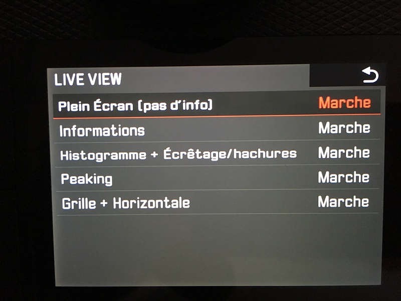 C'est l'un ou l'autre, on passe d'un type d'affichage à l'autre, les types étant ceux-ci :![]() On voit que l'on peut enlever du cycle un type d'affichage que l'on n'utilisera pas. Il n'y a pas le choix "Histogramme + Horizontale". Note : même chose pour l'écran arrière, les affichages sont partagées avec le viseur.