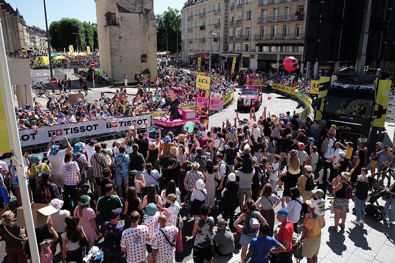 La caravane du Tour (9 juillet 2025 à Caen) J'avais une super place près du départ de l'épreuve de cette étape contre la montre. Mon intention n'était pas de photographier tous les coureurs. En fin de compte, cela ne m'intéressait pas de les photographier un par un lors de chacun des départs. C'est le passage de la caravane publicitaire et le public quémandeur qui m'a donné l'idée de faire ces prises de vue. J'ai fait une sélection de 18 photographies répétitives de ces moments d'attente et d'immobilité.